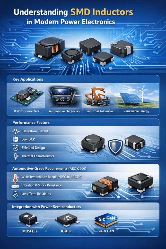 SMD inductors are closely linked with power semiconductor devices such as MOSFETs, IGBTs, and wide bandgap components. In high-frequency switching systems, the interaction between inductors and switching devices directly affects: